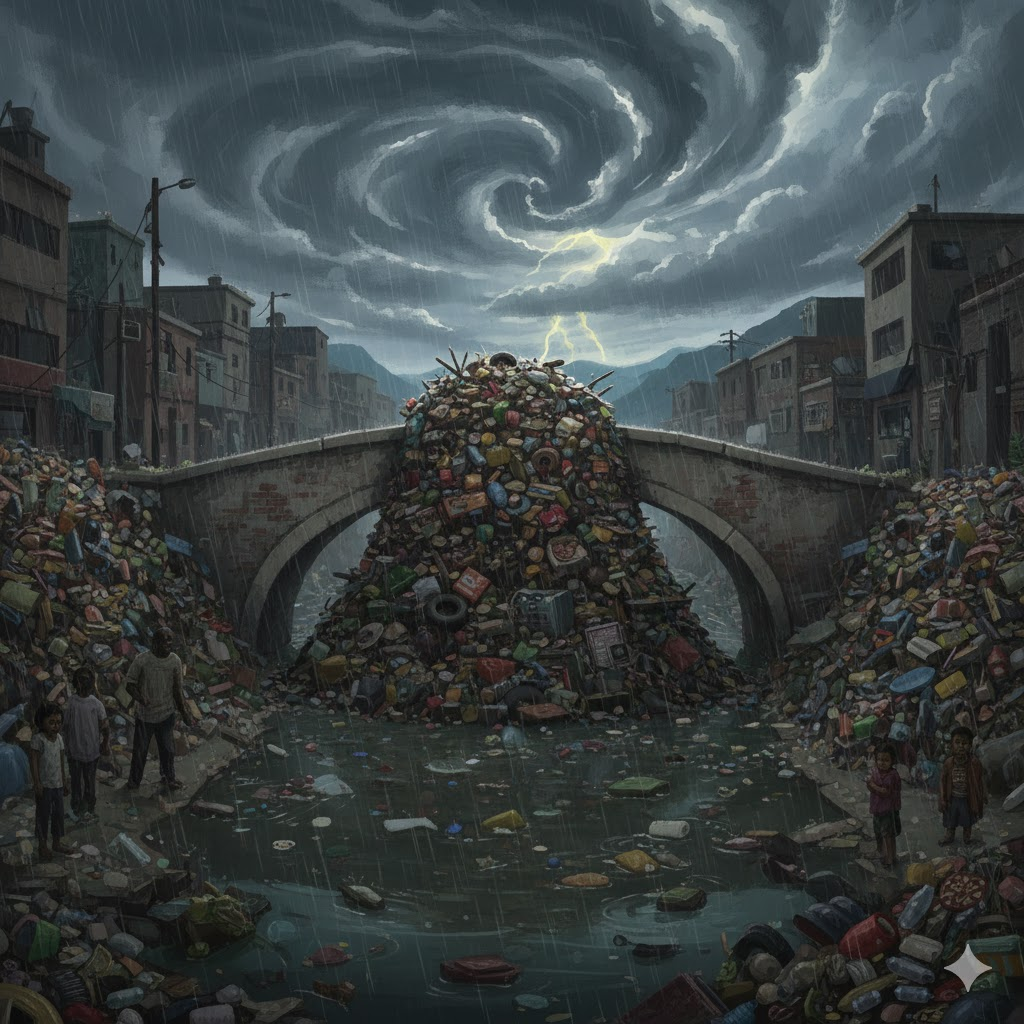 Masalah sampah di parit dan sungai menjadi faktor tambahan. Ketika volume air naik, sampah terbawa arus dan menumpuk, memblokir aliran air.