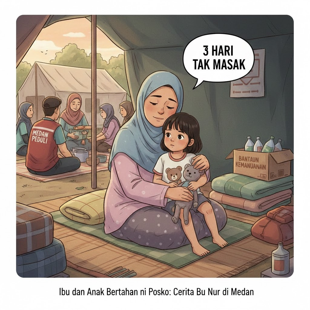 Bu Nur, ibu dua anak, sudah tiga hari berada di posko pengungsian di kawasan Sunggal. Ia bekerja sebagai pedagang kecil, tetapi seluruh barang dagangannya ikut terendam.