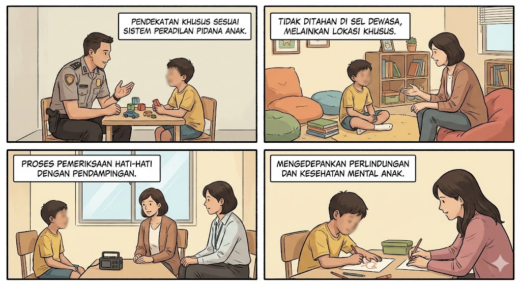 Anak tersebut tidak ditahan di sel orang dewasa, melainkan ditempatkan di lokasi khusus dengan pendampingan psikolog dan petugas terkait. Proses pemeriksaan juga dilakukan secara hati-hati untuk menjaga kondisi mental anak.