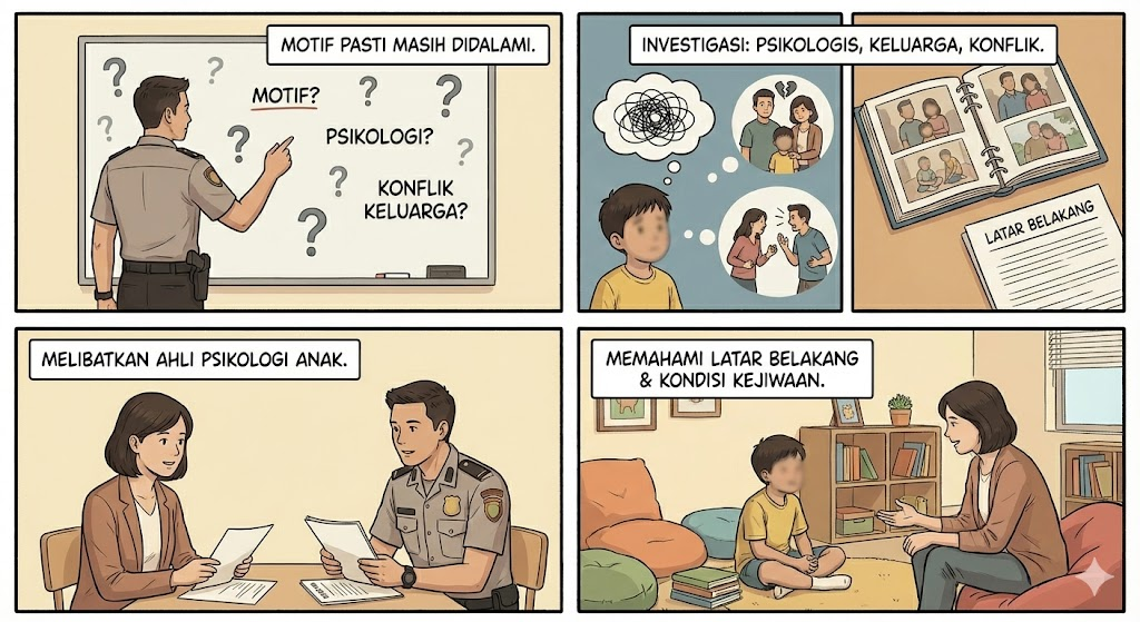Hingga saat ini, motif pasti dari tindakan tersebut masih terus didalami oleh pihak berwajib. Beberapa kemungkinan yang diselidiki meliputi kondisi psikologis anak, lingkungan keluarga, serta dugaan adanya konflik rumah tangga yang terjadi sebelumnya.