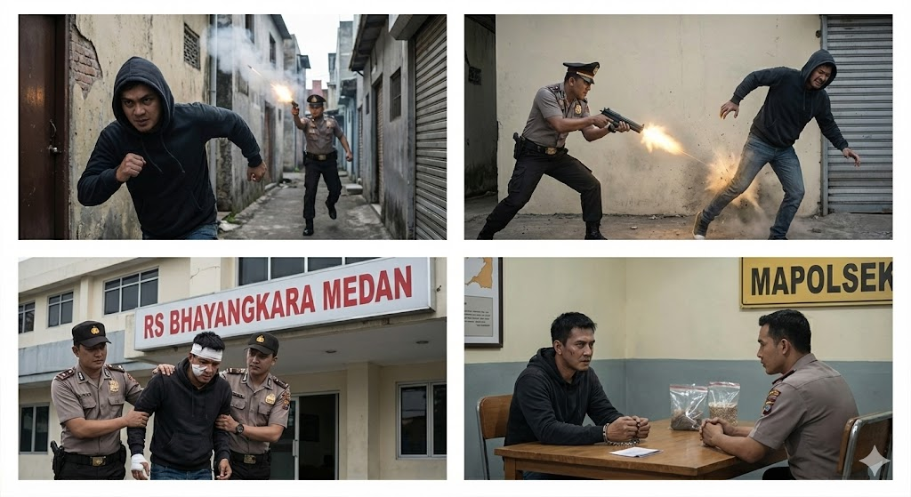Tembakan tersebut mengenai kaki tersangka dan langsung menggiringnya ke RS Bhayangkara Medan untuk mendapatkan perawatan medis. Setelah itu, tersangka dibawa kembali bersama barang bukti ke mapolsek untuk proses hukum lebih lanjut.
